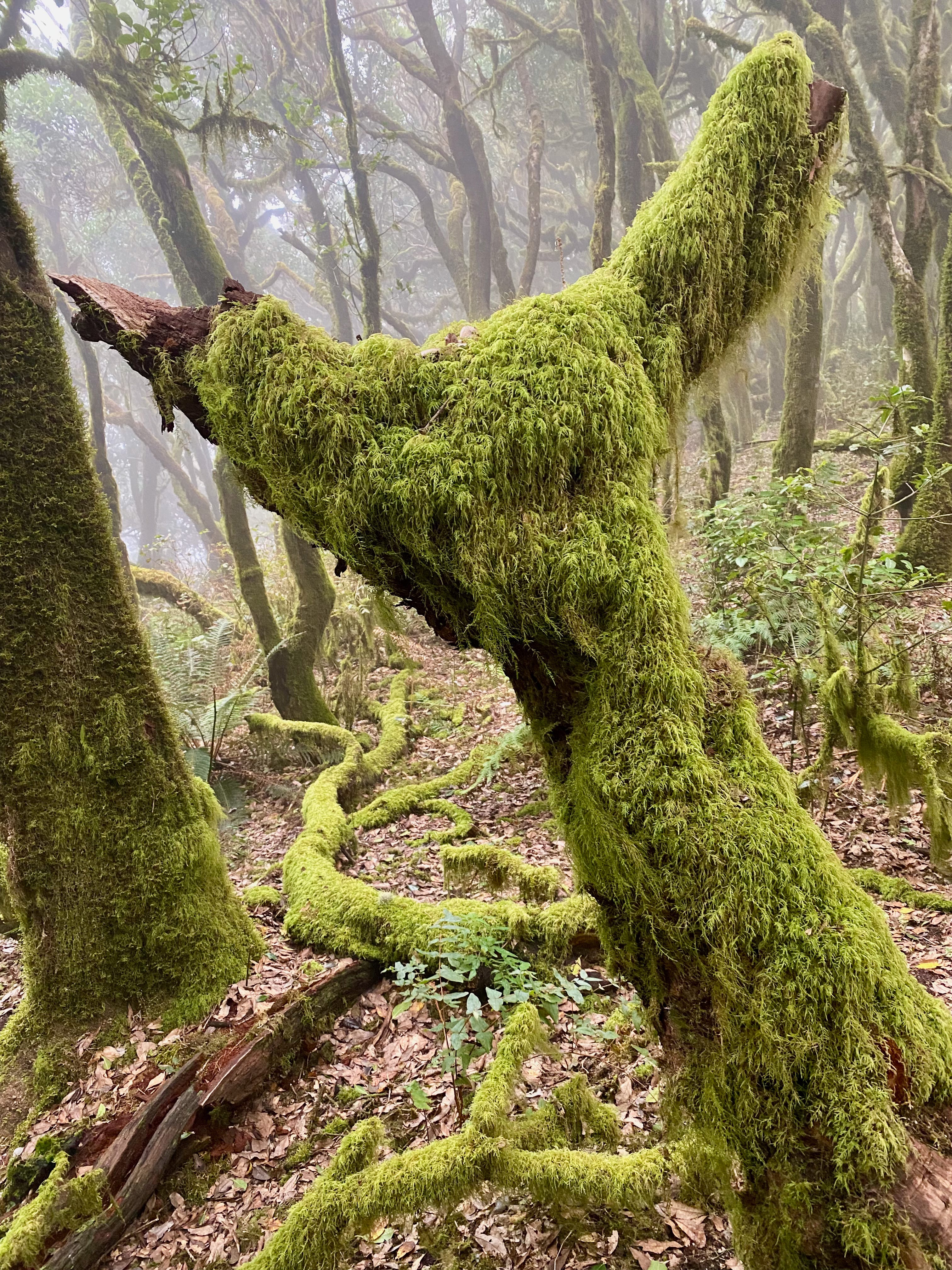 En el otoño de 2021, entre El Cedro y la ermita de Lourdes, Cristina y yo avanzamos con un silencio reverencial, saludando por señas o solo con la mirada a los otros excursionistas. El dosel arbóreo forma una catedral con todos los verdes del mundo. Solo un gran botánico sabría distinguir el millar de especies de líquenes o los cuatrocientos tipos de musgos que crecen en la isla. No importa. Aunque ignoremos sus nombres (o los de los 25 tipos de helechos), líquenes y musgos vivifican cualquier superficie libre de hojarasca. Da gozo verlos tapizando con sus texturas y colores las rocas y los troncos de los árboles, o colgando de las ramas como barbas o cabelleras.
