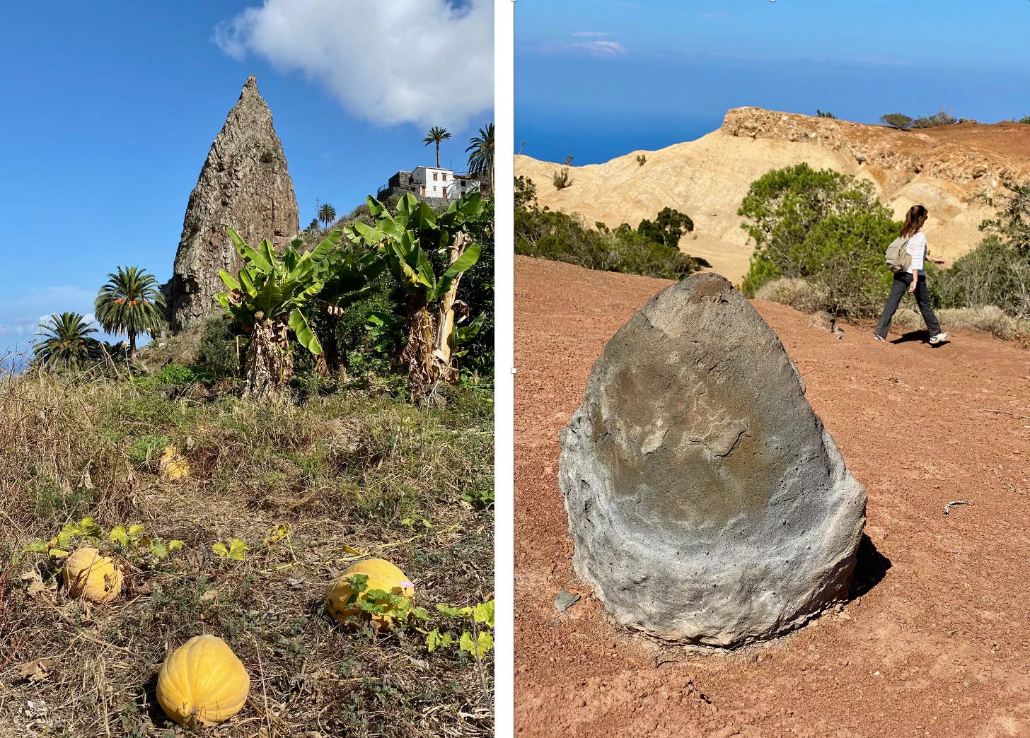 Paseando por los bancales junto a los dos poderosos roques, el guía Ricardo Tomé evoca su infancia en el valle. Nos muestra cómo hojas dobladas con destreza se convertían en barquitos que competían corriente abajo en el arroyo de El Cedro. El único llano libre de cultivos, más pequeño que una cancha de baloncesto, hacía de campo de fútbol, pero con la excitación del juego era habitual tropezar con la enorme peña que sigue aflorando en medio. Las grandes hojas del ñame servían de paraguas o permitían improvisar una botella.
