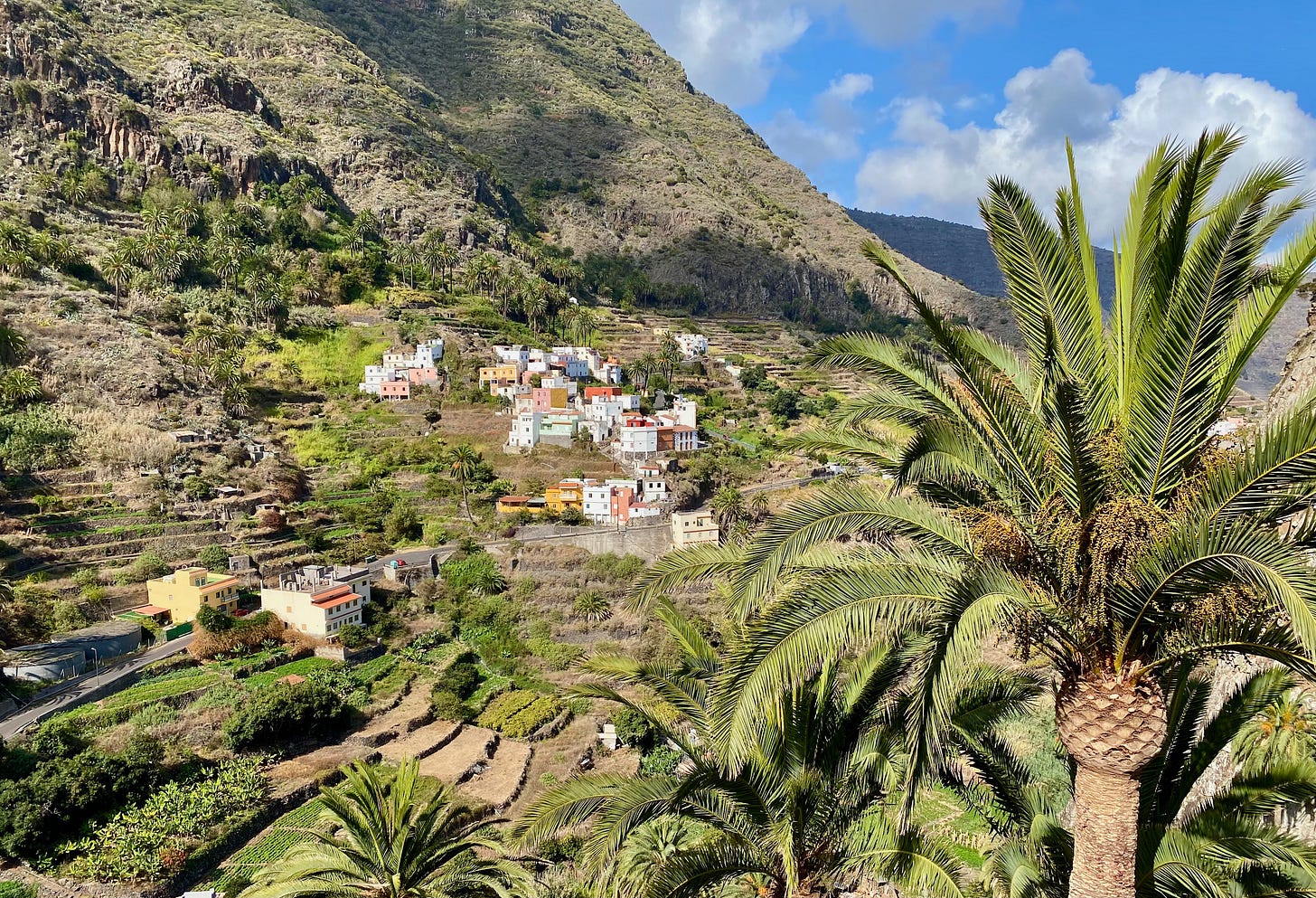 Contemplar los bancales de Hermigua trepando hacia la montaña, salpicados de racimos de palmeras y casas coloridas, alegra el espíritu. También evidencia que las únicas superficies llanas de la isla son las que crearon los campesinos a fuerza de brazos. A medida que las tierras más fértiles se destinaban al cultivo de plataneras, hubo que construir nuevos bancales monte arriba para obtener los alimentos esenciales: patatas, maíz, judías, garbanzos, calabazas, coles, ñame... Las lomas rocosas, no aptas para la agricultura, acogían las humildes viviendas.