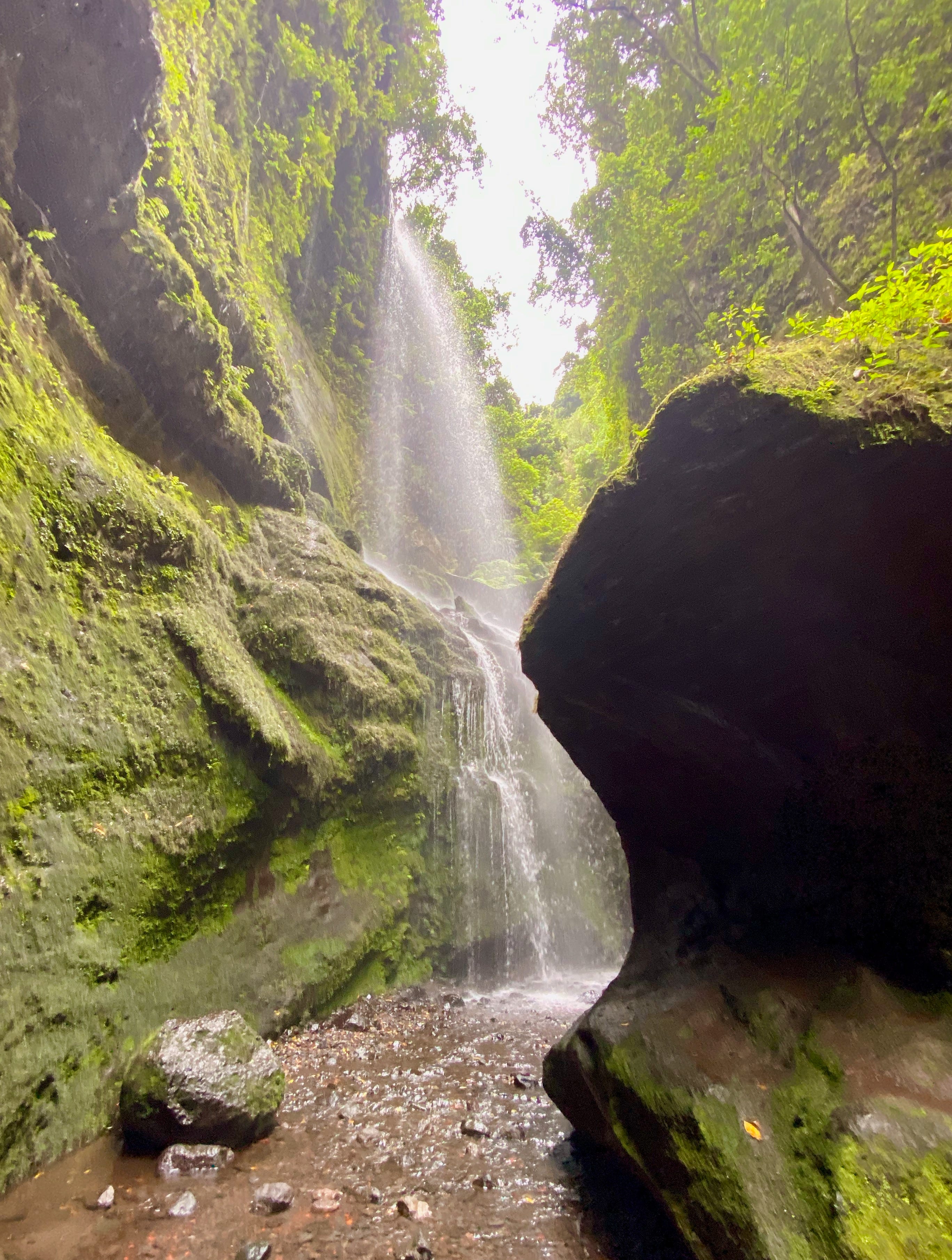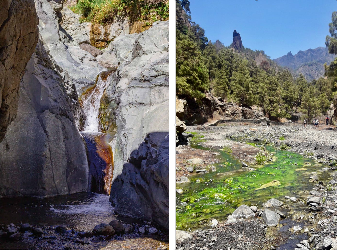 El fragor de la acequia se amplifica cuando atravieso caminando el sinuoso túnel que lleva a la cascada de los Tilos, el otro gran hito de la laurilsilva palmera. La dificultad de la obra indica que el agua fue el verdadero capital en la isla: tenía más valor que la tierra. La cascada está domesticada pero la belleza del paraje justifica el paseo. Quienes acudieron desde el cercano aparcamiento se hacen selfis antes de retornar. Algunos excursionistas mejor equipados culminan aquí el exigente descenso por el barranco del Agua, siguiendo el fabuloso sendero de Marcos y Cordero. Requiere subir con taxi todoterreno al punto de partida y llevar casco y linterna para atravesar sus trece túneles, en algunos de los cuales caen cortinas de agua.