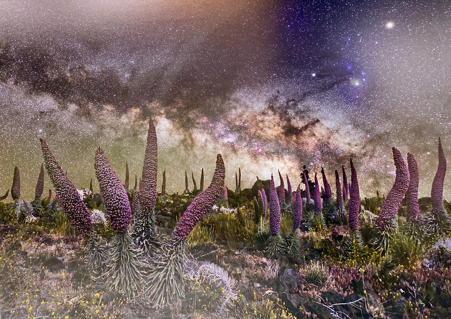 La Caldera de Taburiente es un sumidero al interior de la Tierra pero también a los misterios del cosmos. Pasear por su elevada cresta a pleno día, por encima del manto de nubes que generan los vientos alisios, permite admirar panoramas fantásticos y una vegetación adaptada a condiciones extremas. La planta estrella en este ecosistema de altura es el esbelto tajinaste: cada primavera, sus voluminosos y gráciles cilindros se rebozan de flores violáceas, a continuación la planta muere.