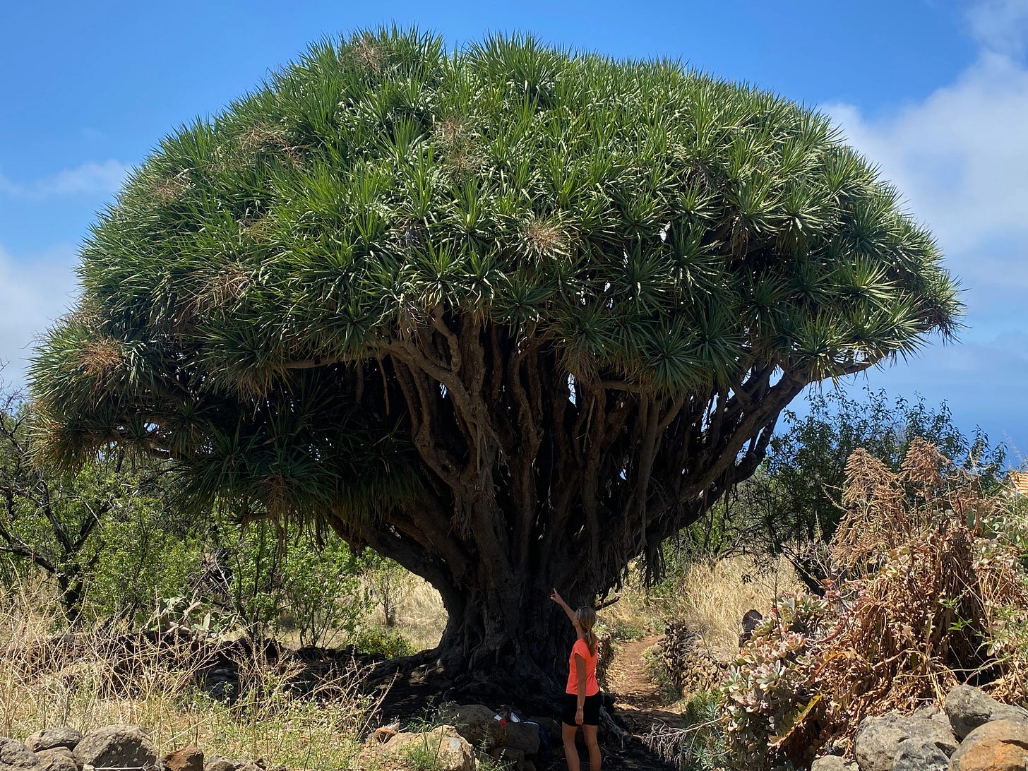 Cerca, en la aldea de Las Tricias, se halla el que probablemente sea el conjunto de dragos más espectacular de Canarias. Esta gigantesca planta de porte arbóreo, emblema de la Macaronesia, crece muy lentamente. Al principio, su tallo recto, coronado por un ramillete de hojas que parecen lanzas verdes, evoca una pequeña palmera. Pero a partir de los treinta años el drago empieza a ramificarse, y su estructura se va repitiendo a diferentes escalas, a la manera de un fractal, como si el conjunto estuviera contenido también en cada una de sus partes. Esas divisiones se producen cada 15 años y permiten deducir su edad, pues el tronco carece de anillos. Las raíces adventicias, que nacen del tallo, penetran en la tierra y llegan a formar parte del tronco, engrosándolo y ayudando a la planta a anclarse en el suelo. Pasado su primer siglo, el drago adquiere un porte venerable. Por si no bastase con su nombre, tan poco vegetal, y la medicinal savia, que se coagula en sus heridas adoptando el color de la sangre, algo reptiliano parece latir en su corteza y en su aspecto. ¿Será capaz de percibir de algún modo nuestra presencia mientras realiza la fotosíntesis bajo el sol?