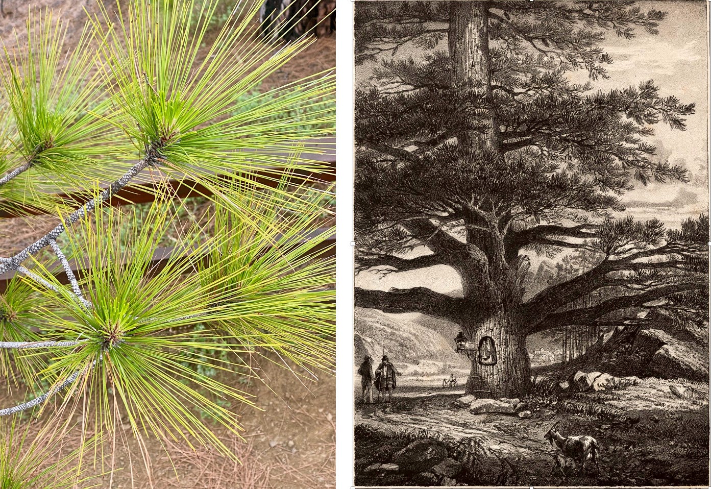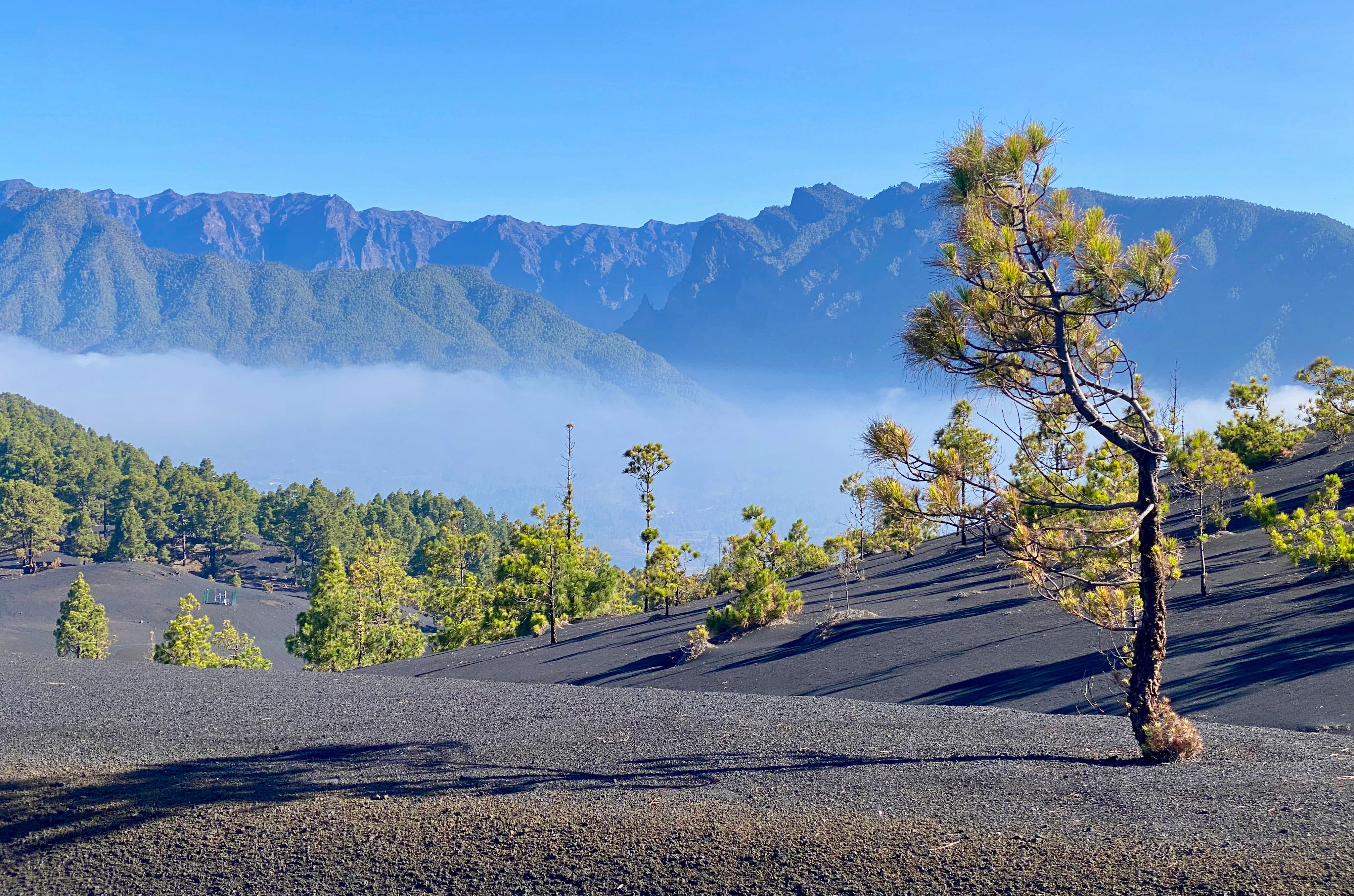 La Caldera de Taburiente también hechiza a media altura desde el Mirador de la Cumbrecita, al que se accede con reserva de aparcamiento y del que parten caminos de poca dificultad. En ellos se evidencia que los bosques de pino canario son el otro gran tesoro de La Palma. Los árboles tienen aquí un porte majestuoso. Presentan largas raíces superficiales y sus acículas, dispuestas en tríos y no en dúos como las hojas de otros pinos, llegan a medir 30 cm. Eso les permite captar mejor la humedad del aire. La gruesa corteza, un hojaldre de capas que protege la médula del tronco donde se concentra la resina (la tea), es capaz de resistir temperaturas de 470 ºC durante 45 minutos, lo que les permite rebrotar tras el paso de un incendio... o de una erupción como la del otoño de 2021. El pino de la Virgen de El Paso ya destacaba cuando Fernández de Lugo conquistó la isla. Se considera el más antiguo en su especie.
