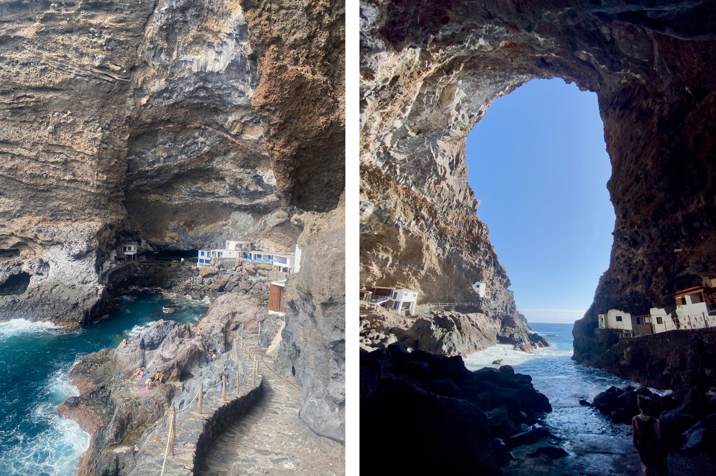 Proís de Calendaria es un enclave único en el mundo. Para acceder desde Tijarafe a este embarcadero la carretera se retuerce como un sacacorchos y desciende 600 m en menos de 4 km, por una pendiente tremenda. Tras aparcar el vehículo, los últimos 80 m se salvan a pie por escalones al borde del acantilado. Nos aguarda un entrante del mar con una cavidad bajo la cual los isleños han excavado 40 habitáculos casi rupestres. Pero con luz eléctrica que alimenta neveras y bombillas, y agua, pagada comunitariamente, para los baños y las cocinas. Quien posee uno de estos sombreados refugios suele pasar en él los fines de semana y las vacaciones. Impresiona escuchar los relatos de cómo los acondicionaron, o ver las distintas habitaciones, adaptadas a las formas de la roca, o las pesadas cargas que acarrean escaleras abajo. Un océano sin domesticar acecha al borde del acantilado y provee de diversión y alimento a los intrépidos nadadores. Las puestas de sol resultan espectaculares en esta cavidad, enmarcadas por un arco rocoso que esboza el mapa de La Palma.