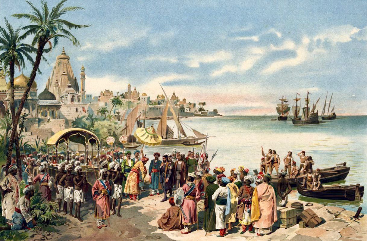 En 1453, la conquista de Constantinopla por los turcos cierra a los mercaderes cristianos las rutas marítimas y terrestres que conducen a la India y dispara el precio de las especias. Pero en 1488 ocurre lo imprevisto: Bartolomeu Dias, un marino portugués, dobla el cabo de Buena Esperanza. Ante él se extiende el océano Índico: la ruta de las especias. Sin embargo, pasadas unas semanas, con pocos víveres y las carabelas maltrechas por un temporal, la tripulación se niega a seguir avanzando. Diez años después, en mayo de 1498, Vasco de Gama desembarca cerca de la ciudad india de Calicut. Entre la multitud congregada en la playa, dos musulmanes tunecinos le dan la bienvenida y le preguntan en español para qué ha navegado tan lejos.