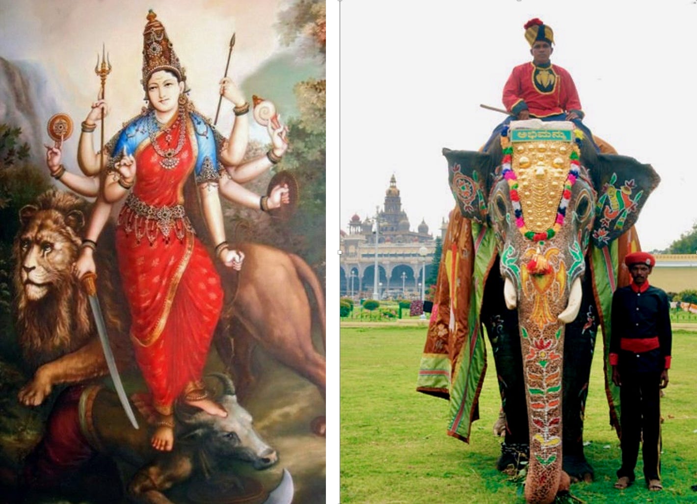 Los brahmanes viven el Dasara como una especie de purificación o progresión espiritual. Por ejemplo, el séptimo día se honra a Sarasvati, la diosa del conocimiento. Se reverencian los libros del hogar, que se limpian de polvo, y la lectura queda terminantemente prohibida a fin de renovar el poder mágico de las letras para que sigan derramando su sabiduría el año siguiente. El noveno día tiene lugar el Ayudhapuja o «culto a las armas». Con flores adquiridas en los mercados se engalanan los utensilios de cocina, el escritorio y el ordenador, la azada y el arado, los animales que ayudan en el campo, todo tipo de herramientas e instrumentos musicales, y en especial los vehículos de transporte. Sus conductores construyen para ellos pabellones vegetales con copas de bananos y cañas de azúcar. Más allá del agradecimiento, el objetivo es que shakti, la energía que genera la materia, penetre en las herramientas y renueve su efectividad. El décimo día tiene lugar el gran desfile que cierra la fiesta. Lo preside el elefante real (ahora estatal), acompañado de otros elefantes, camellos, caballos, guardias con lanzas, danzarines, carrozas y charangas de músicos que, como escribió Òscar Pujol, «escupen una música inconexa pero incongruentemente pegadiza». En 2025, el Dasara se celebra en Mysore del 23 de septiembre al 2 de octubre. De aquel artículo, publicado en la primavera de 1993 en Altaïr, se ofrece hoy una versión digital en la web de Viajes National Geographic. Este es el enlace.