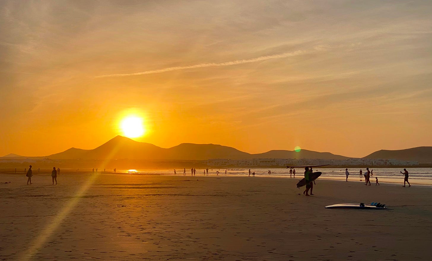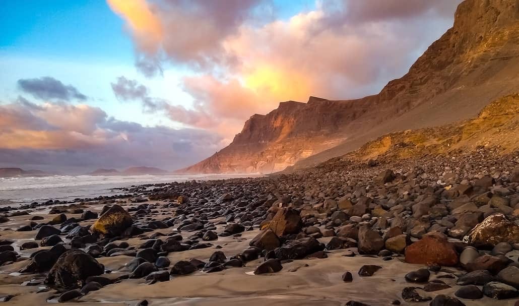 Con sus dunas y el inmenso arenal que despeja la marea baja, las puestas de sol en Famara congregan a isleños y foráneos. Hay espacio y amplitud para todos. Y no se sabe en qué dirección pasear, o mirar: el espectáculo del cielo, la sucesión de olas, el risco encendido, los reflejos de la luz en la húmeda arena o en los ojos de amigos y desconocidos...