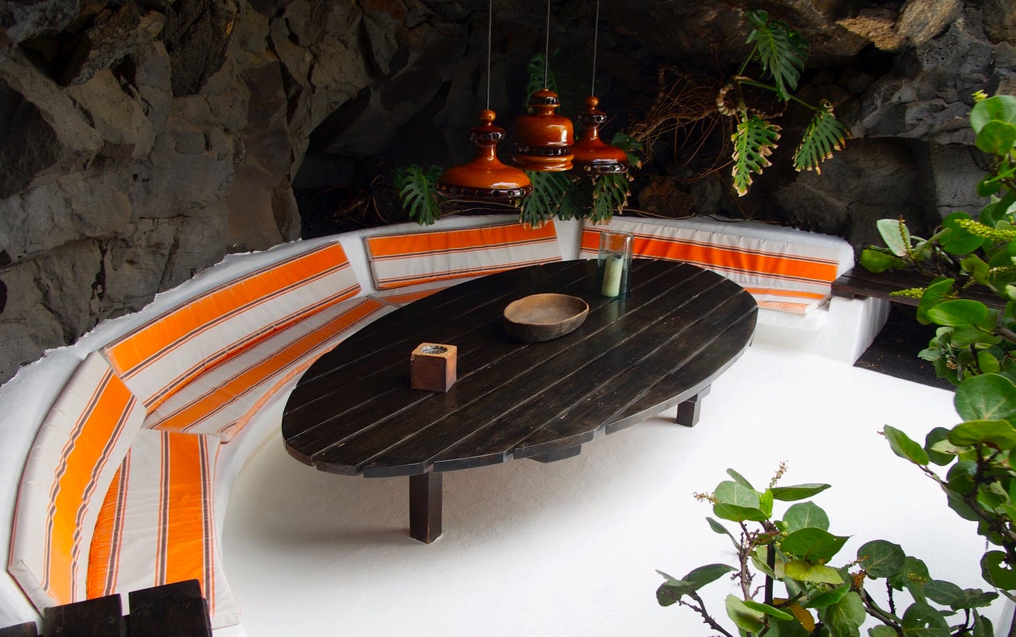 El pueblo majo o maho, el primero que habitó la isla, abría refugios en oquedades y túneles en la lava que completaban con paredes discretas. Era una forma óptima de protegerse del calor y también de camuflarse ante saqueadores venidos por mar. César Manrique se basó en esa humilde arquitectura bioclimática al construir su primera casa, sede de su actual fundación, en la que vivió de 1968 a 1988. A partir de cinco grandes burbujas en la lava, creó espacios fascinantes comunicados entre sí. En su antiguo estudio, un gran cristal enmarca el paisaje, transformado así en un cuadro tridimensional que cambia en función de la luz del cielo, mientras la colada de lava exterior se abre paso bajo la pared.