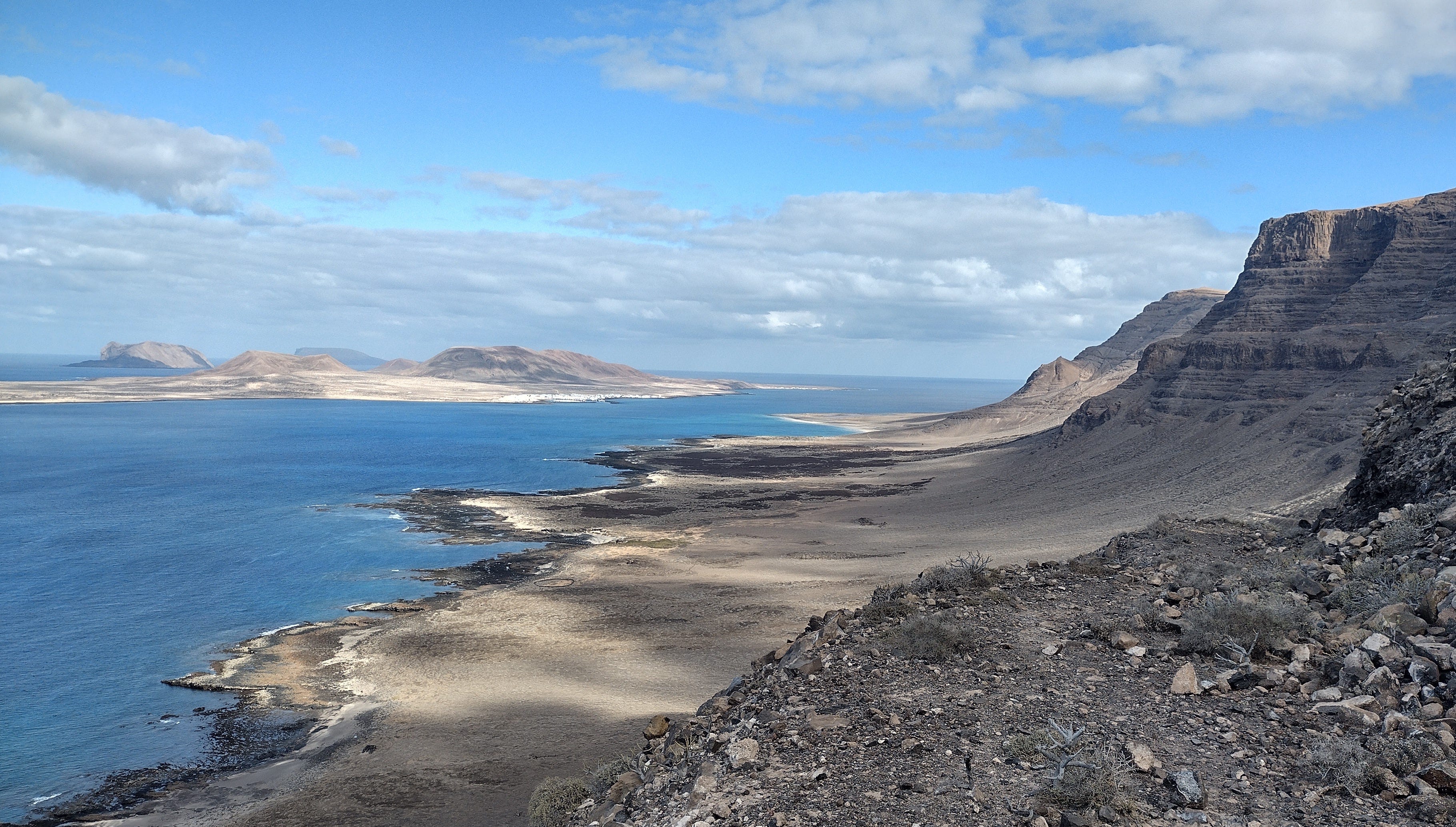 En Lanzarote se hace vida a ras de tierra. Pero si hay un lugar en la isla donde sentir el vértigo de soñar con nuevos horizontes, ese es el Risco de Famara. El audaz sendero que lo surca a media altura, con algún tramo peligroso, parte de un aparcamiento no vigilado y lleva en seis horas a la playa de Famara. Arranca con un exigente descenso, lo que permite bañarse en la prístina y solitaria playa del Risco, cara a cara con La Graciosa. Ese empinado tramo inicial se llama Camino de las Gracioseras, en honor a las mujeres de esa isla, que en otros tiempos lo subían cada día cargando en la cabeza cestas con 30 kg de pescado, y se dice que descalzas, para no gastar sus alpargatas de esparto. Luego retornaban a La Graciosa con otros productos.