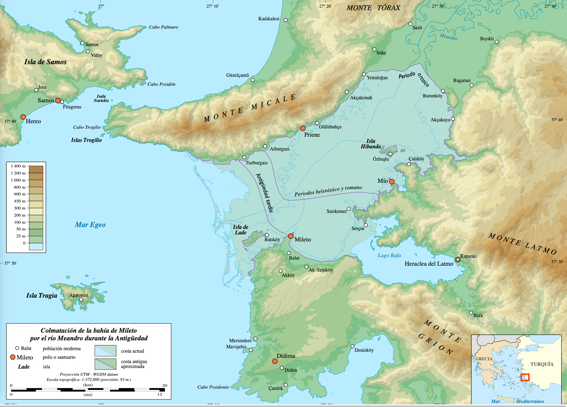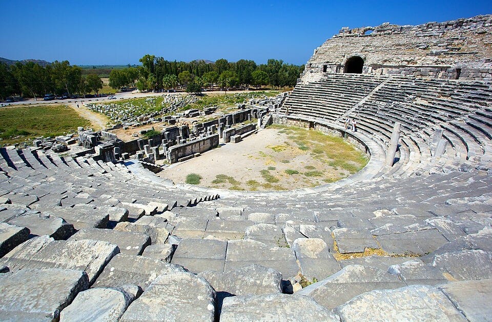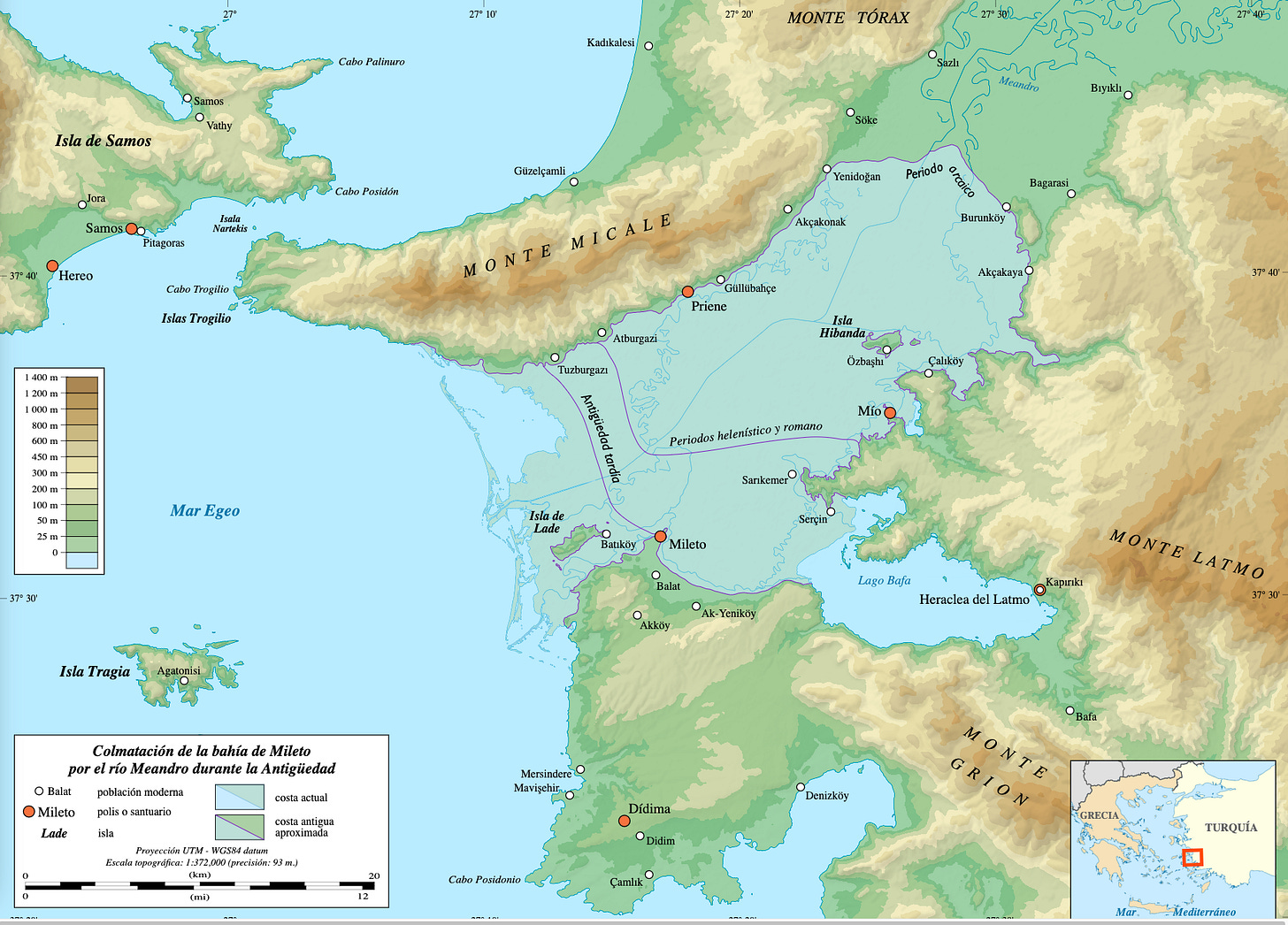 A principios del siglo V a.C., Darío I destruye Mileto. La conquista persa se vive como una tragedia en Atenas y marca el paso del periodo arcaico al clásico en la filosofía griega. La ciudad se vuelve a levantar adoptando el innovador plano en retícula de Hipodamo de Mileto, padre del urbanismo moderno. Pero los sedimentos que arrastra el río Meandro (Büyük Menderes en turco), cuyos bucles designan hoy a cualquier gran curva fluvial, acaban cegando el activo puerto de Mileto y la bahía que la separa de la ciudad de Priene, al norte. De Mileto nos ha quedado el teatro ampliado por los romanos, un estadio y un conjunto de ruinas que se inundan en los meses lluviosos, entre solitarios campos de algodón. Priene es una ciudad menor, pero su templo de Atenea encarna la quintaesencia del arte jónico. Las cinco esbeltas columnas que lo caracterizan muestran hasta qué punto el arte griego supo hacerse uno con el paisaje. Tras ellas se eleva el telón rocoso del monte Micale.