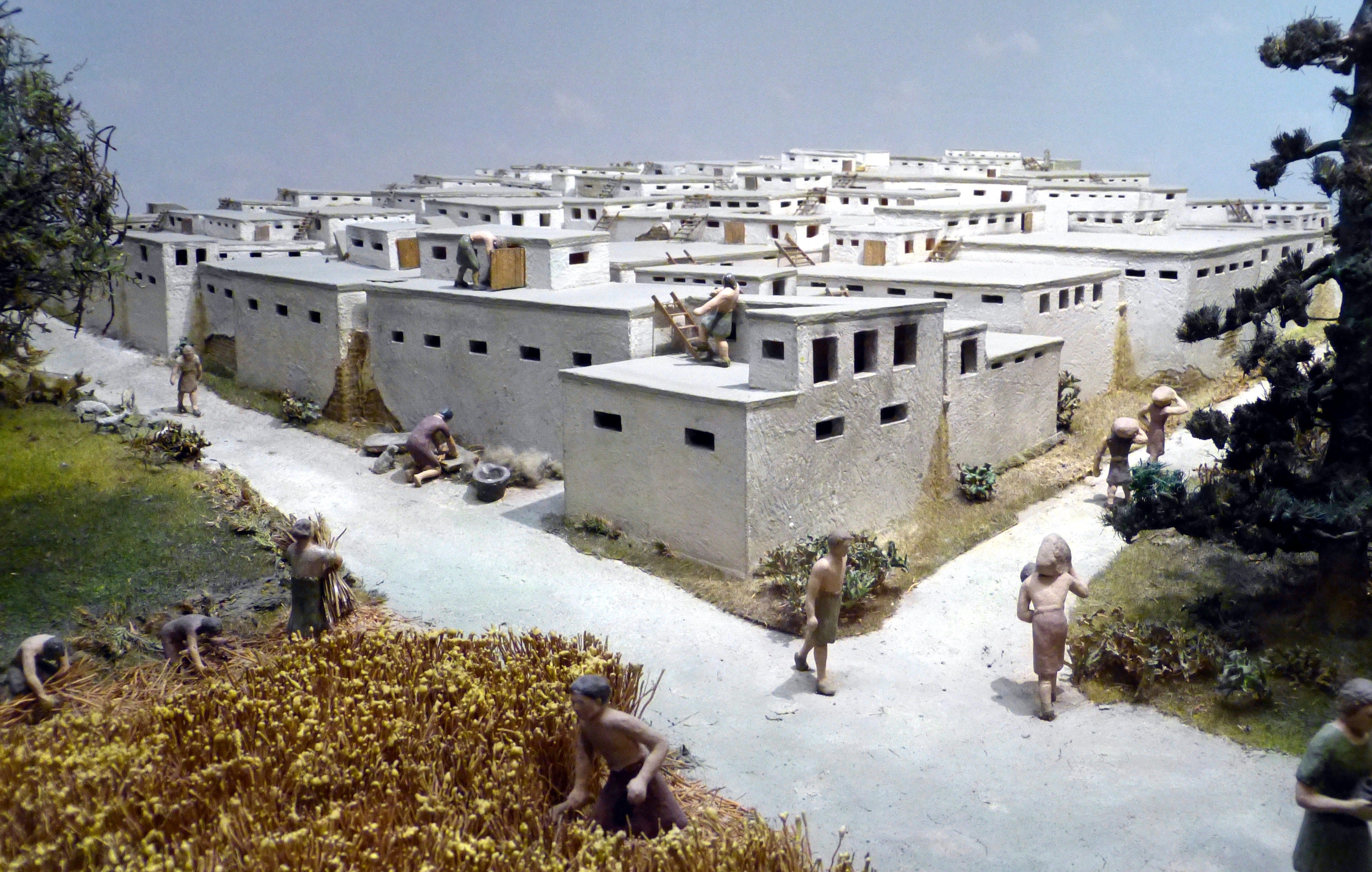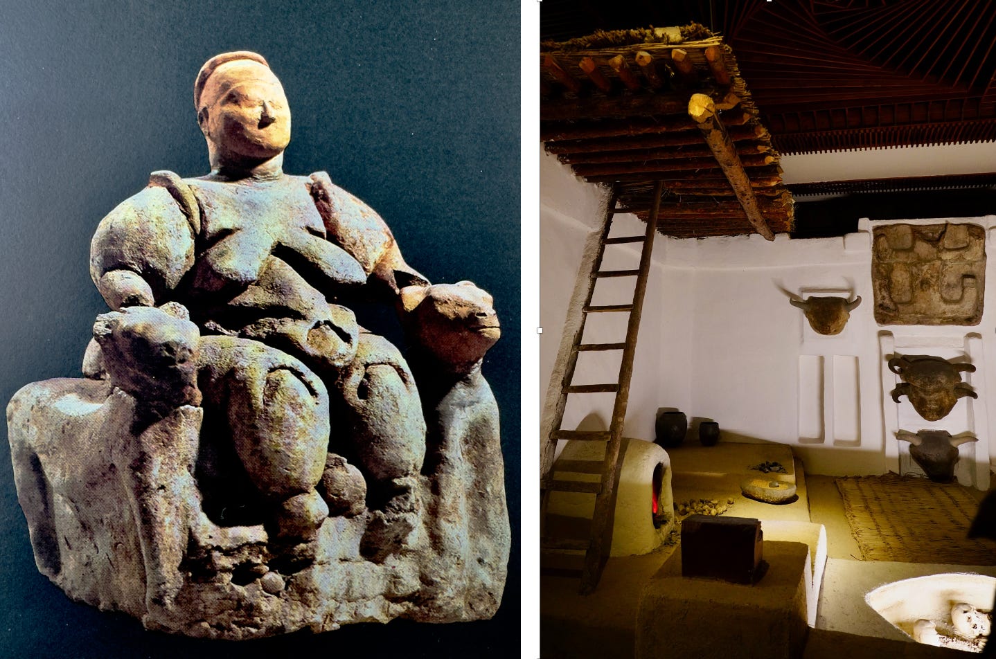 Este viaje en el tiempo empieza ante la estatuilla de la diosa madre de Çatalhöyük, que da a luz sentada en un trono flanqueada por dos leones o dos leopardos. Las casas de esta ciudad del octavo milenio a.C., la más antigua que se conoce, se apiñan como en una colmena: no hay calles ni puertas y se accede a ellas por una abertura en el tejado que también sirve de chimenea. Las viviendas de adobe tienen las paredes finamente enyesadas y el suelo cubierto de esteras. Las decoran murales que representan escenas de caza o cabezas de toro a tamaño natural modeladas en arcilla. Y cuentan con horno de pan, pues los habitantes de Çatalhöyük son hábiles agricultores y ganaderos: cultivan trigo, cebada, lino, garbanzos, lentejas y guisantes, y cosechan almendras, manzanas y pistachos de árboles que plantan en las colinas. Prensan aceites vegetales, han domesticado la oveja y la cabra y empiezan a domar el uro. Saben fundir el cobre, que incorporan en sus joyas, y se acicalan con espejos de obsidiana que obtienen del vecino volcán Hasan Dag. Hacia el año 5.700 a.C., un gran incendio destruye Çatalhöyük, pero paradójicamente la preserva para la posteridad al cocer los ladrillos de arcilla seca, lo que da más consistencia a las paredes.